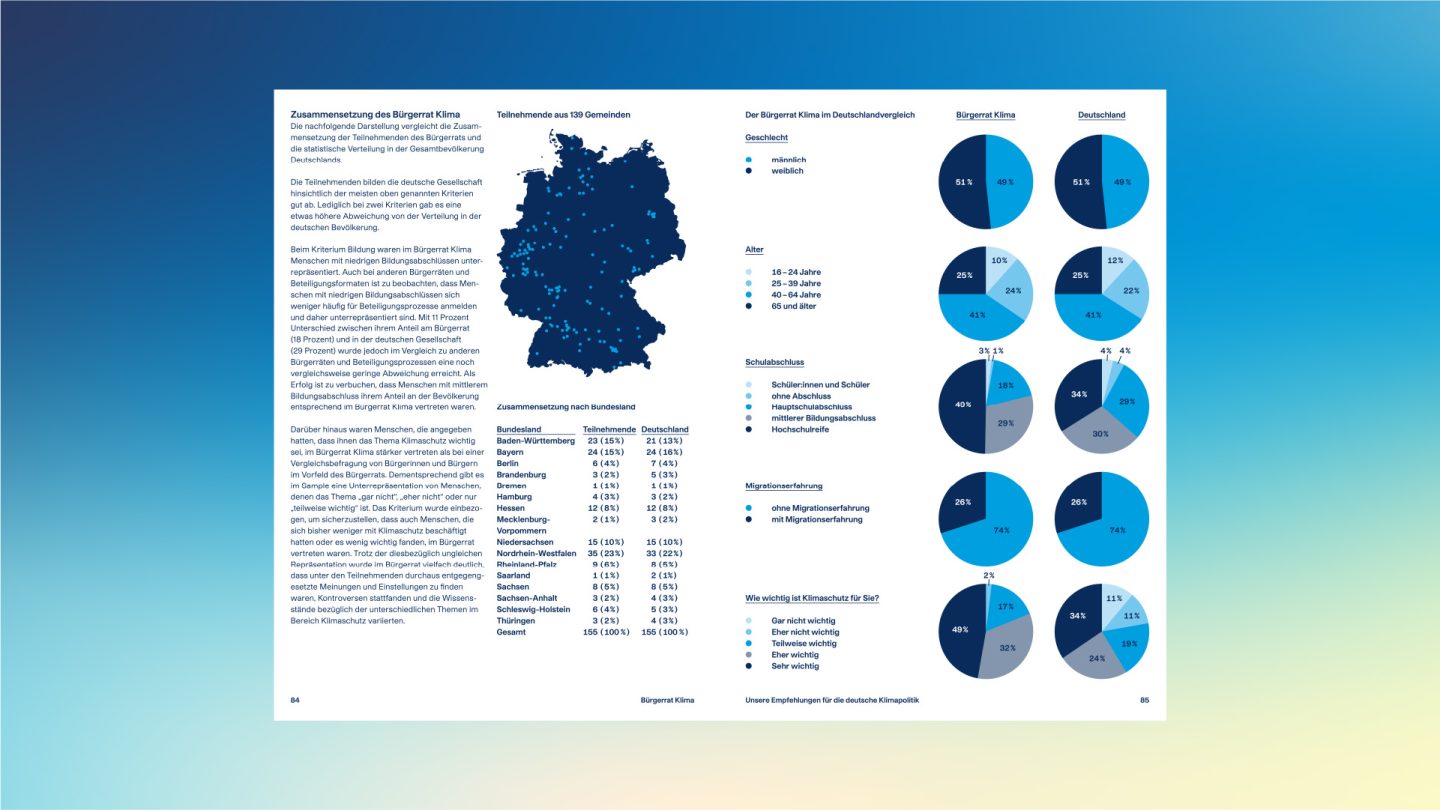 Climate assembly design for Germany’s first Citizens’ Assembly on Climate required a visual identity system spanning print, digital, and spatial applications. Germany is a signatory to the Paris Agreement on climate protection and wants to contribute to limiting the global rise in temperature to 1.5 degrees centigrade. In order to reach this target, the German Bundestag passed a climate protection law in 2019. However, it is uncertain that Germany will be able to achieve its climate targets through this law alone.