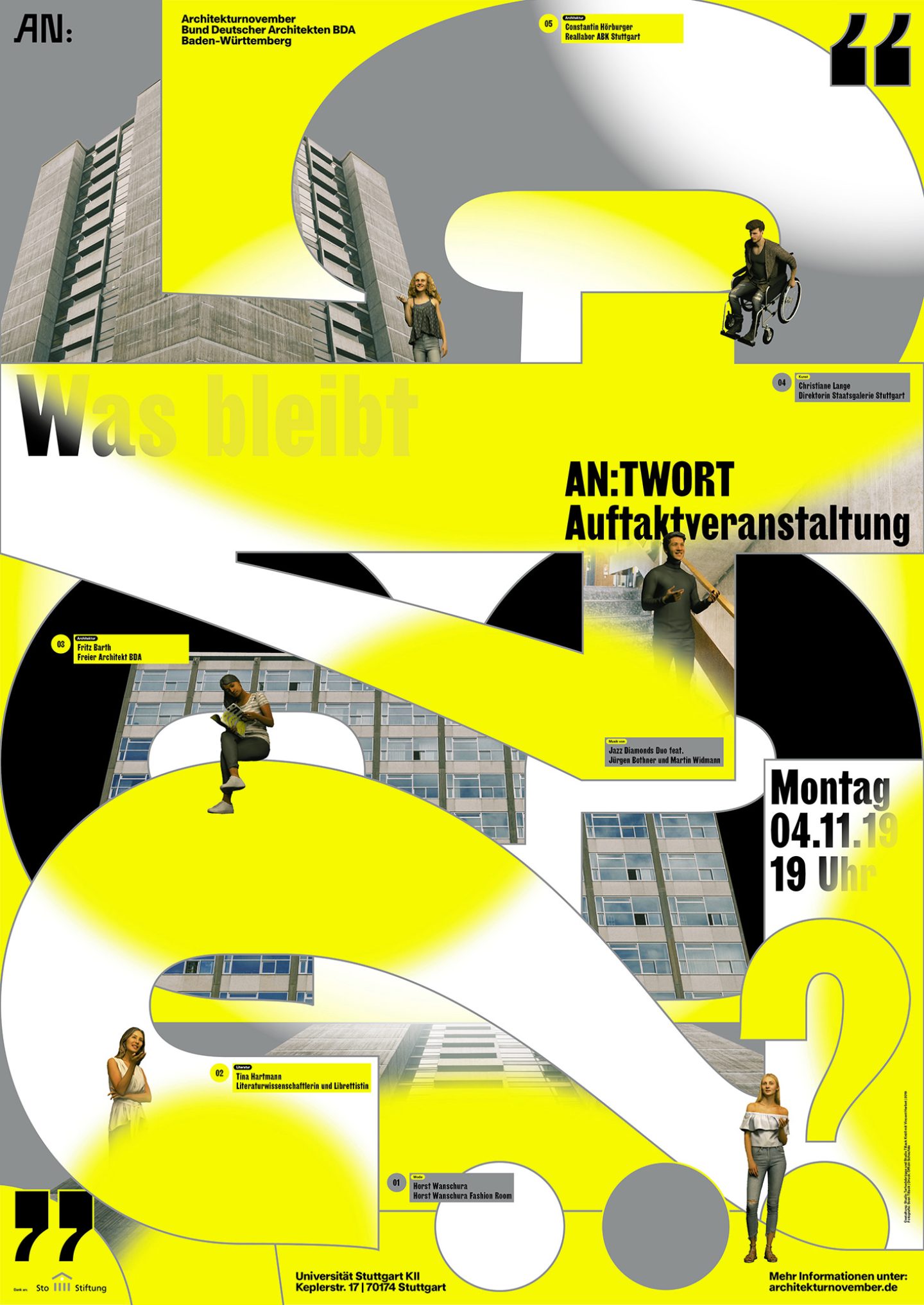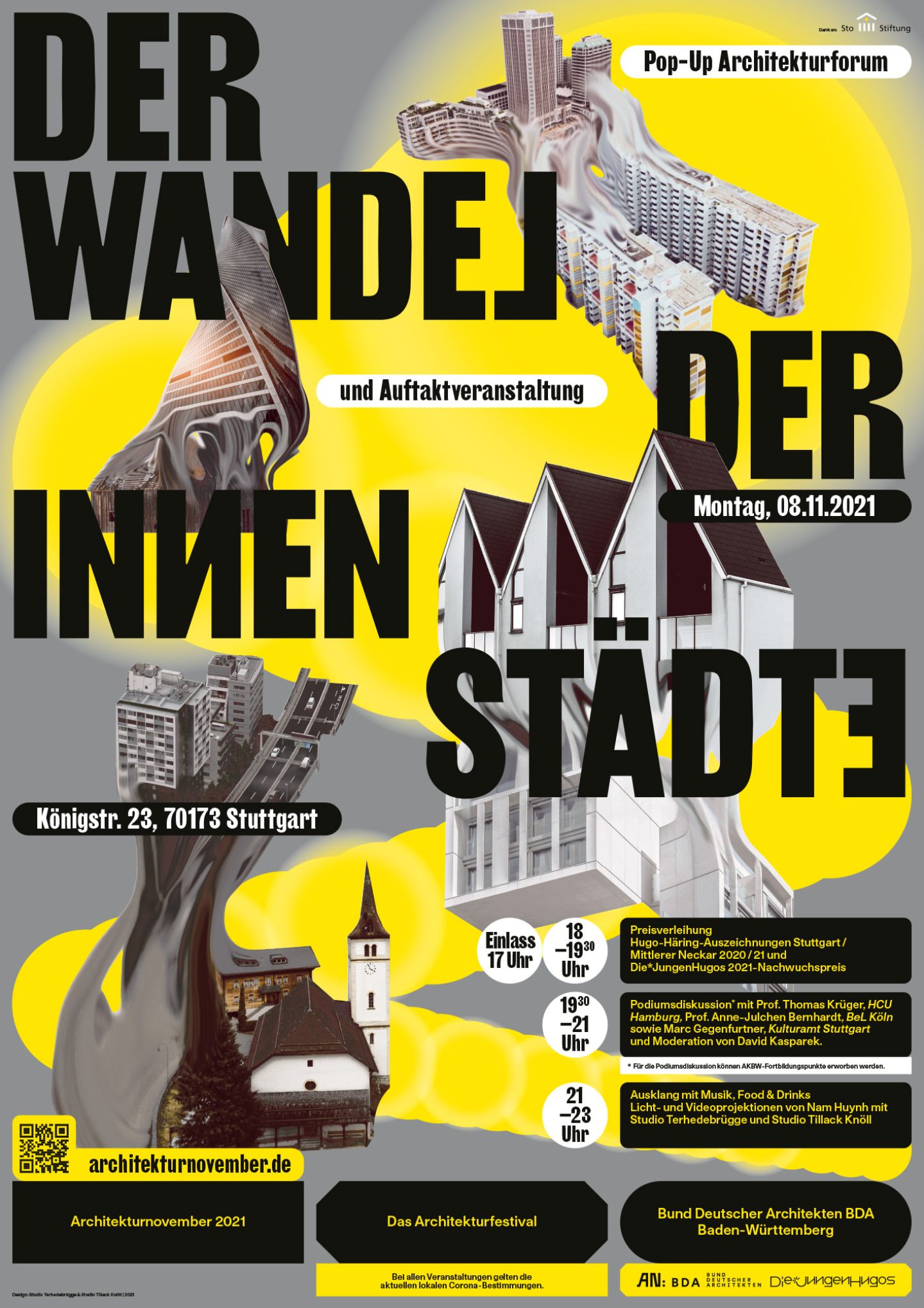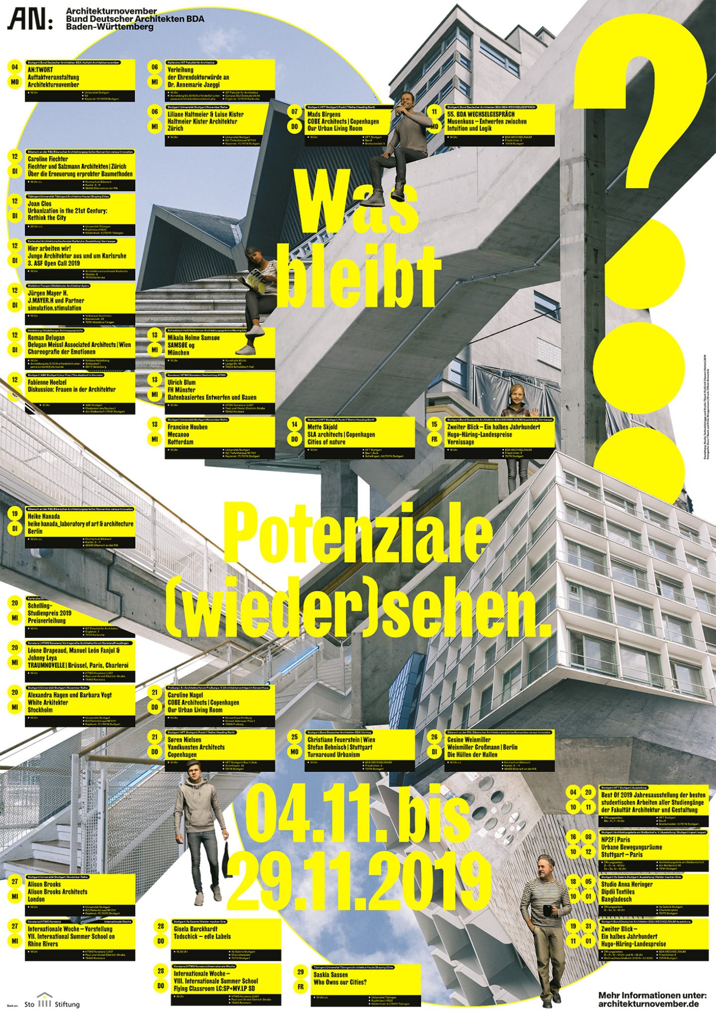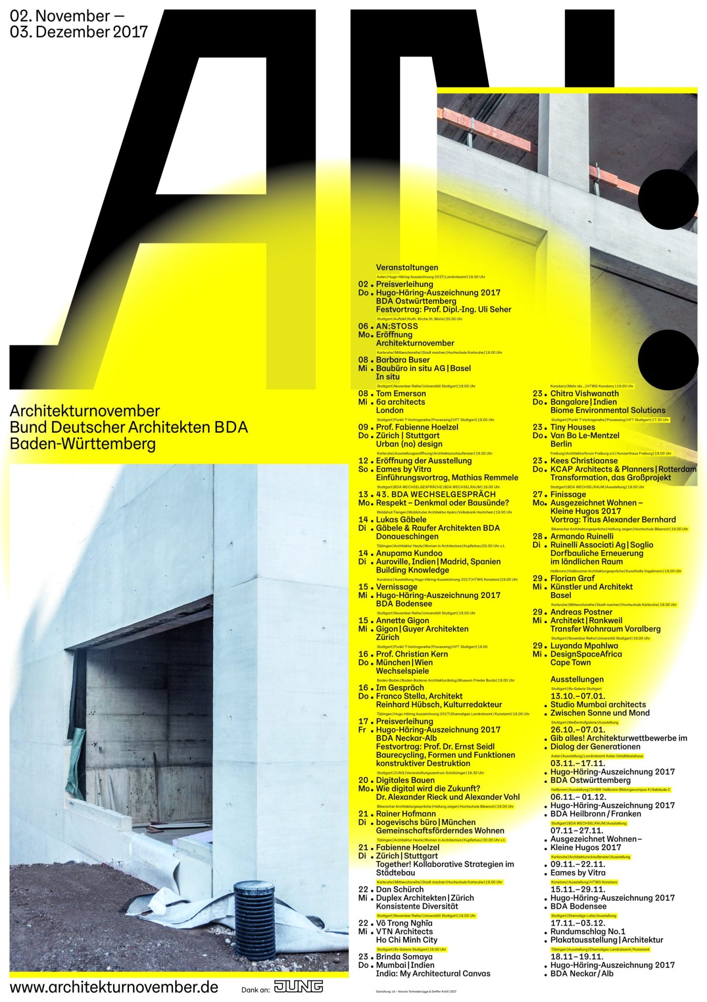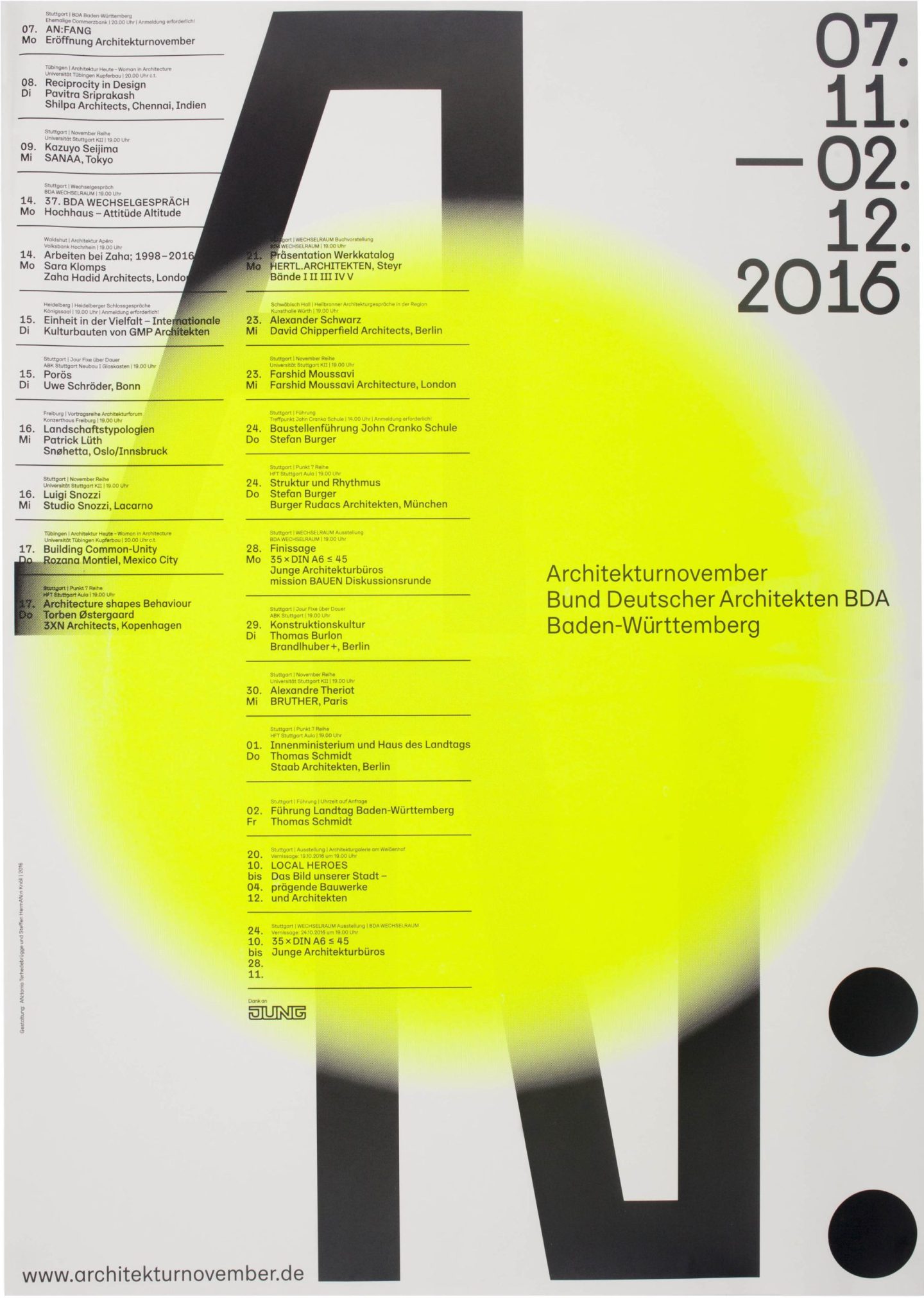 Besides architects and architectural practices the following institutions and concepts have contributed to the Architekturnovember’s success: Architekturgalerie am Weißenhof, Architekturschaufenster, University of Stuttgart, KIT — Karlsruher Institute of Technology, Haus für Film und Medien Stuttgart, Heilbronner Architekturgespräche, HFT Stuttgart, HTWG Konstanz, ifa gallery, IBA ’27, State Academy of Art and Design Stuttgart, WECHSELRAUM BDA.