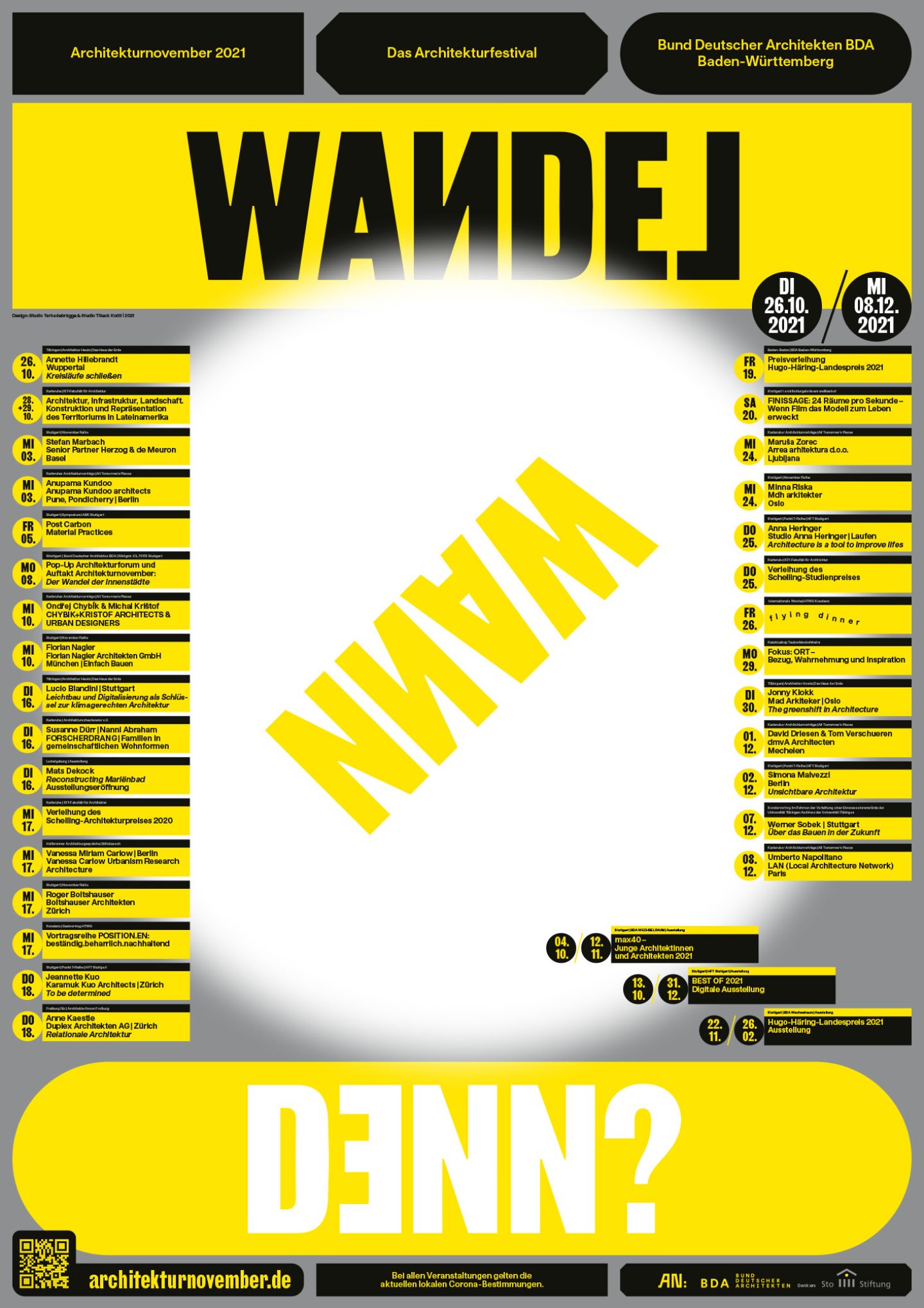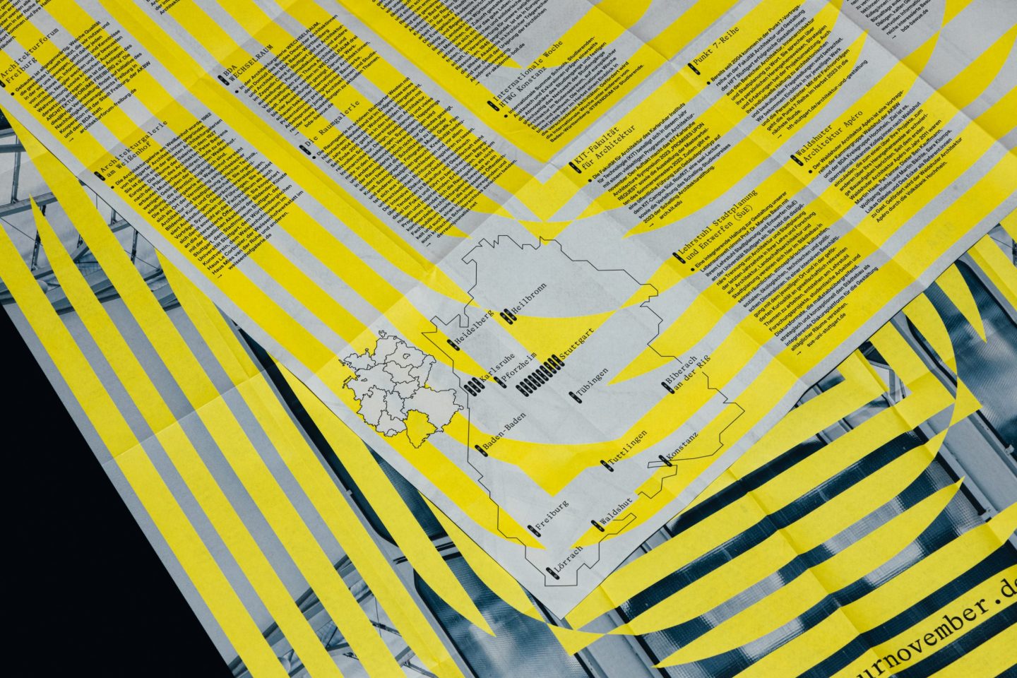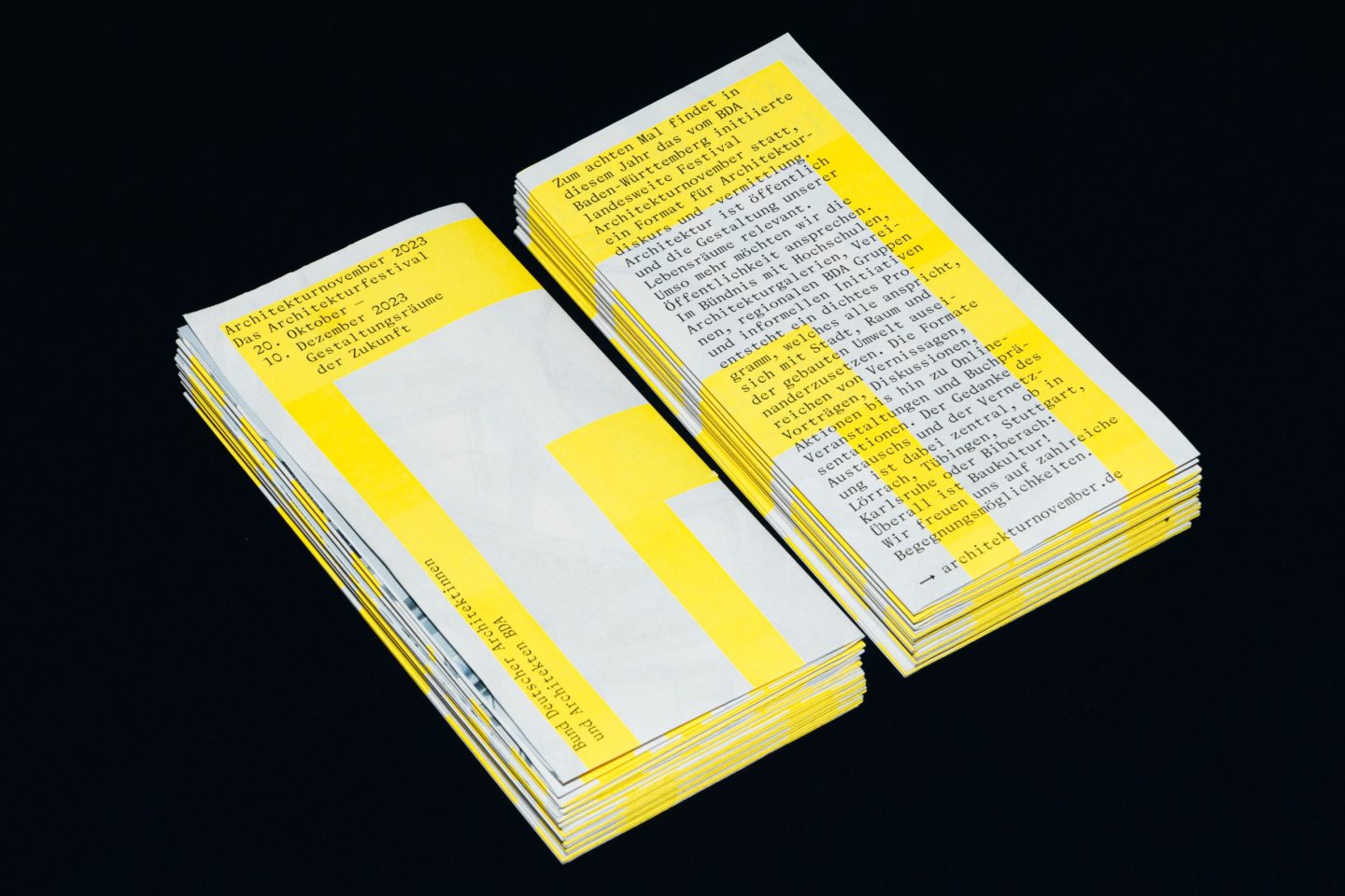 Architekturnovember is a month-long architectural festival organised by the Bund Deutscher Architektinnen und Architekten BDA Baden-Württemberg e. V. [Association of German Architects in Baden Württemberg] that spreads and instils an interest in architecture and its social relevance to dedicated citizens. The festival identity is constantly evolving since 2016.