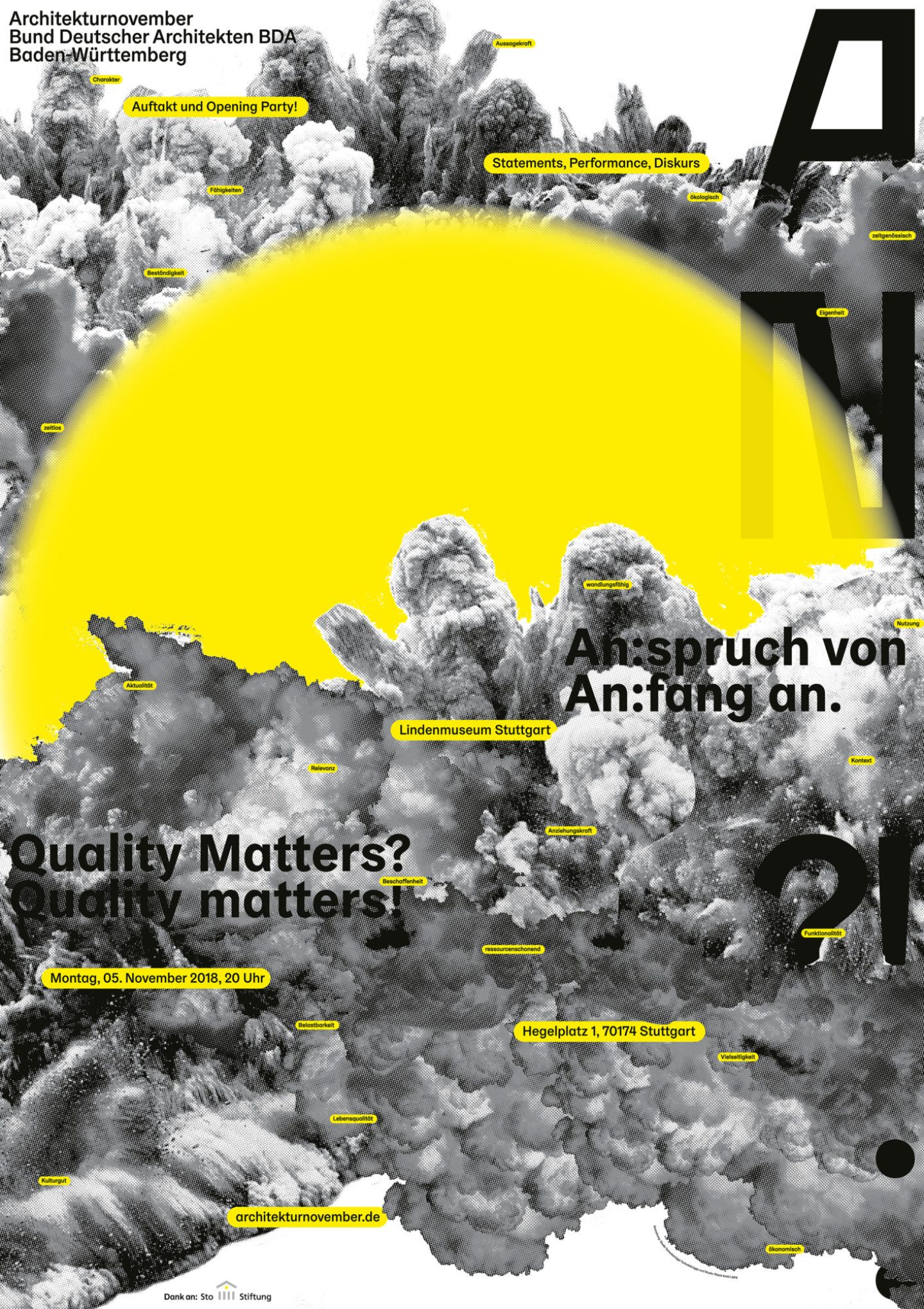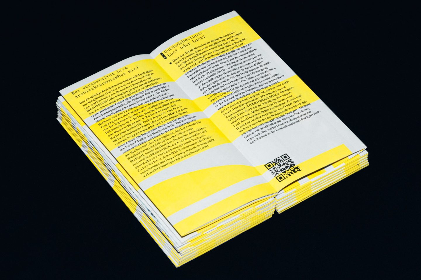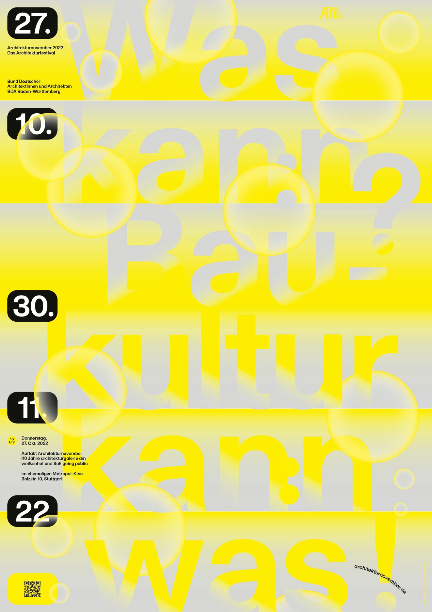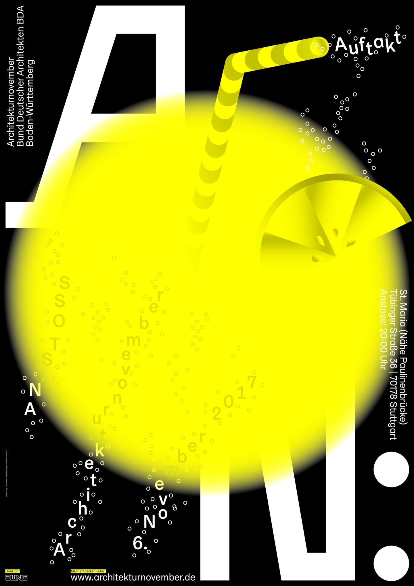 Architekturnovember is a month-long architectural festival organised by the Bund Deutscher Architektinnen und Architekten BDA Baden-Württemberg e. V. [Association of German Architects in Baden Württemberg] that spreads and instils an interest in architecture and its social relevance to dedicated citizens. The festival identity is constantly evolving since 2016.