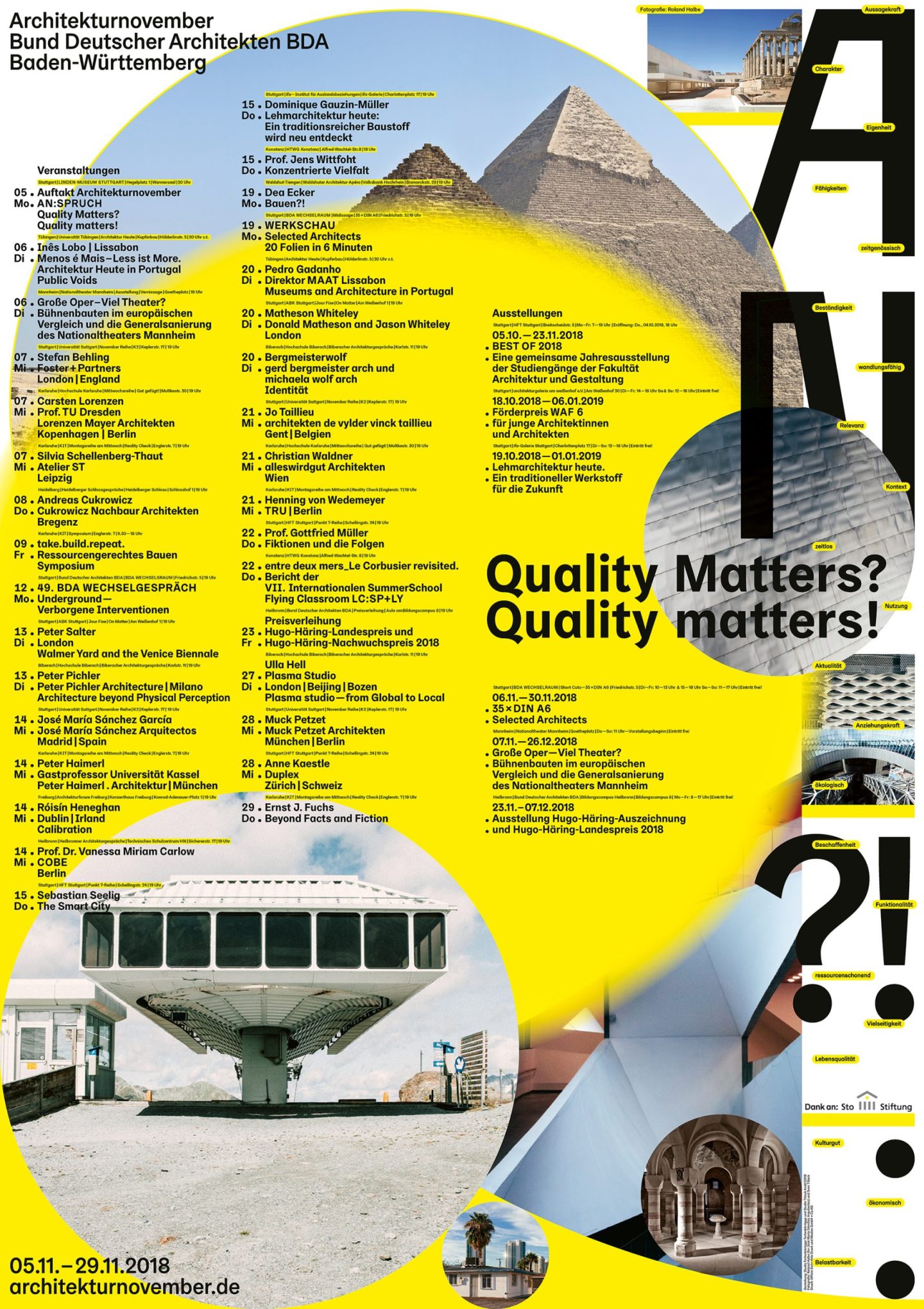 With over 40 events in more than 10 cities yearly, the Architekturnovember is one of the biggest events in Germany celebrating and appreciating high-quality architecture and urban-planning. Due to numerous well-known architects, studios and architectural practices have participated in giving talks, lectures and valuable insights as well as elaborated opinions during discussions, Architekturnovember is a valuable landmark of the local cultural calendar. Overall the following architects and practices included are e. g. SANAA, Zaha Hadid Architects, Snøhetta, Brandlhuber+, 6a Architects, Foster + Partners, Herzog & de Meuron, Jórunn Ragnarsdóttir, Saskia Sassen, Behnisch Architekten.